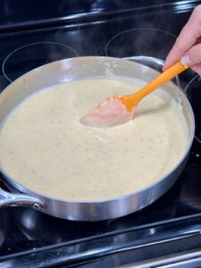 - Make a blonde roux – Melt the half stick of butter in a large skillet over medium heat. Once the butter is melted, whisk in the flour. Cook butter and flour for about 1-2 minutes, whisking often. Then, slowly pour in the milk while whisking constantly to prevent lumps. When all of the milk is added, slowly pour in the half and half, whisking constantly. Continue to heat the roux, whisking often, until a slightly thick and smooth consistency. *Should resemble a thin gravy at this point.