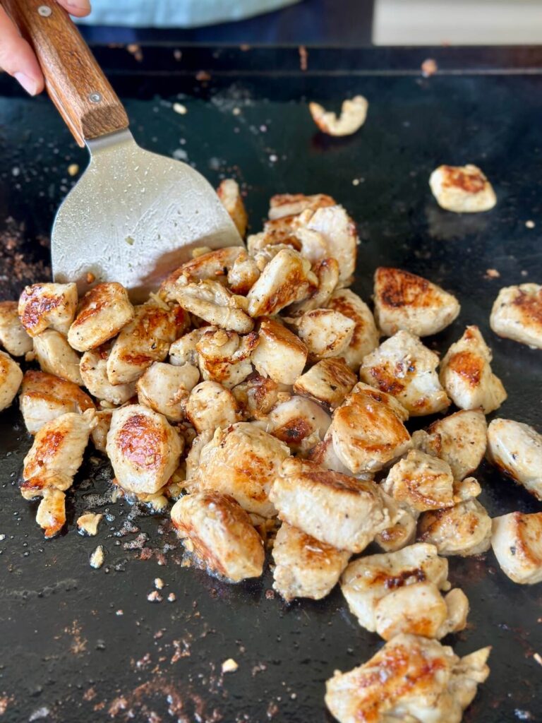 - Flip the chicken bites to the second side, and continue to cook another 3-4 minutes, or until mostly cooked through. Then add the butter sauce with the softened garlic to the chicken, and toss together. *If needed, adjust the griddle temperature down so the garlic and butter do not burn.